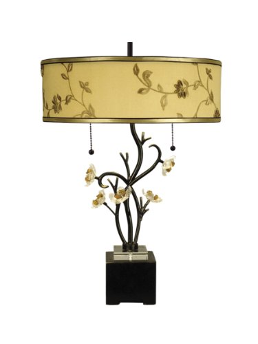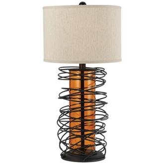 The Horizon series hand-crafted Ponderosa lamp features beautiful amber seeded glass with an energetic iron wrap. The warm glass is a handsome contrast to the spool-like black-finished iron, making this an excellent choice for a transitional or modern decor. Due to the hand-crafted nature of this lamp, no two are exactly alike. Amber seeded glass and iron wrap. Linen hardback drum shade. Takes one 150 watt 3-way bulb (not included). 28 1/2" high. Shade is 15" wide and 10" high..../ Horizon Ponderosa Amber Glass Table Lamp / tiffany lamps